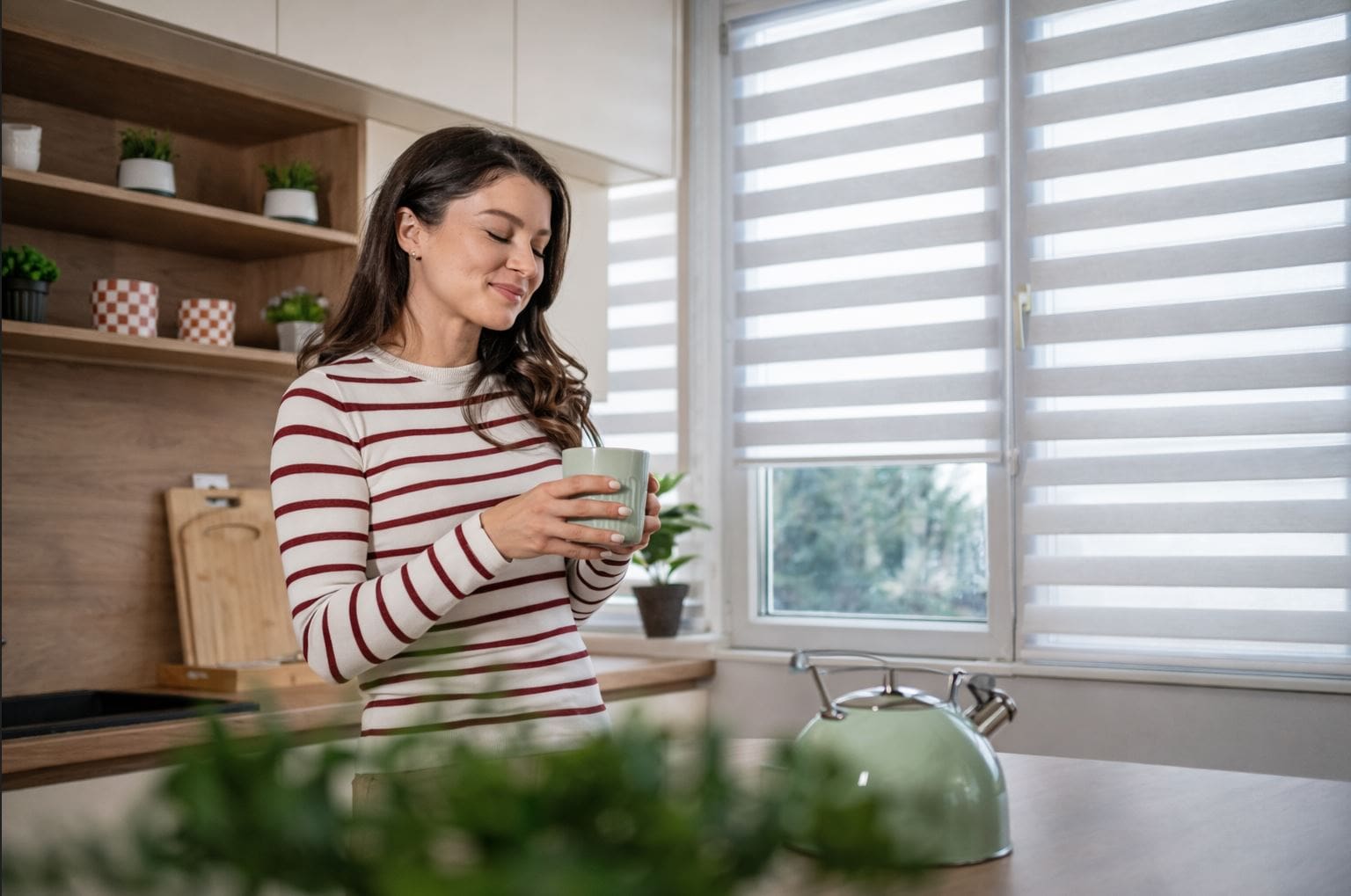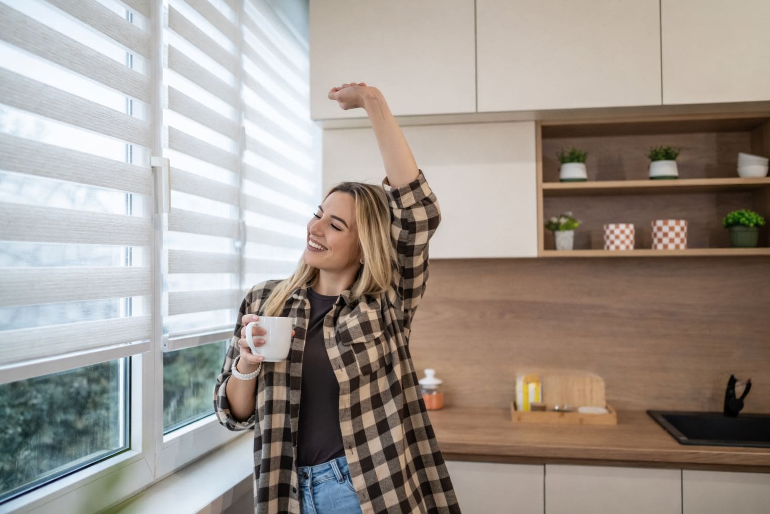 Reguliuokite šviesą taip, kaip norite jūs – valdykite šviesos intensyvumą, sukurti pritemdymo efektą. Dvigubas „ZEBRA“ audinys leidžia vienu judesiu sukurti komfortą jūsų namuose.